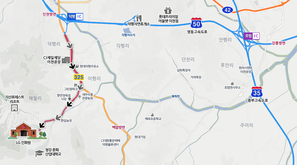 - ※ 덕평 I.C.로 진입하여 오시면 조금 더 안전하게 오실 수 있습니다. (덕평 톨게이트에서 인화원까지 4Km)